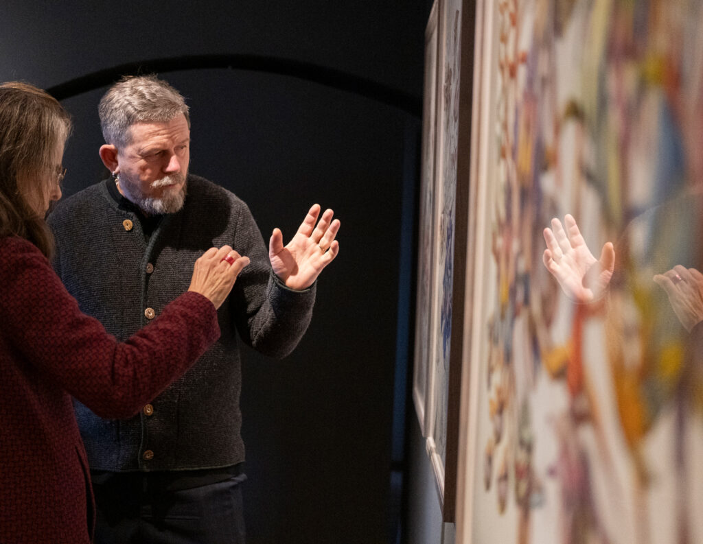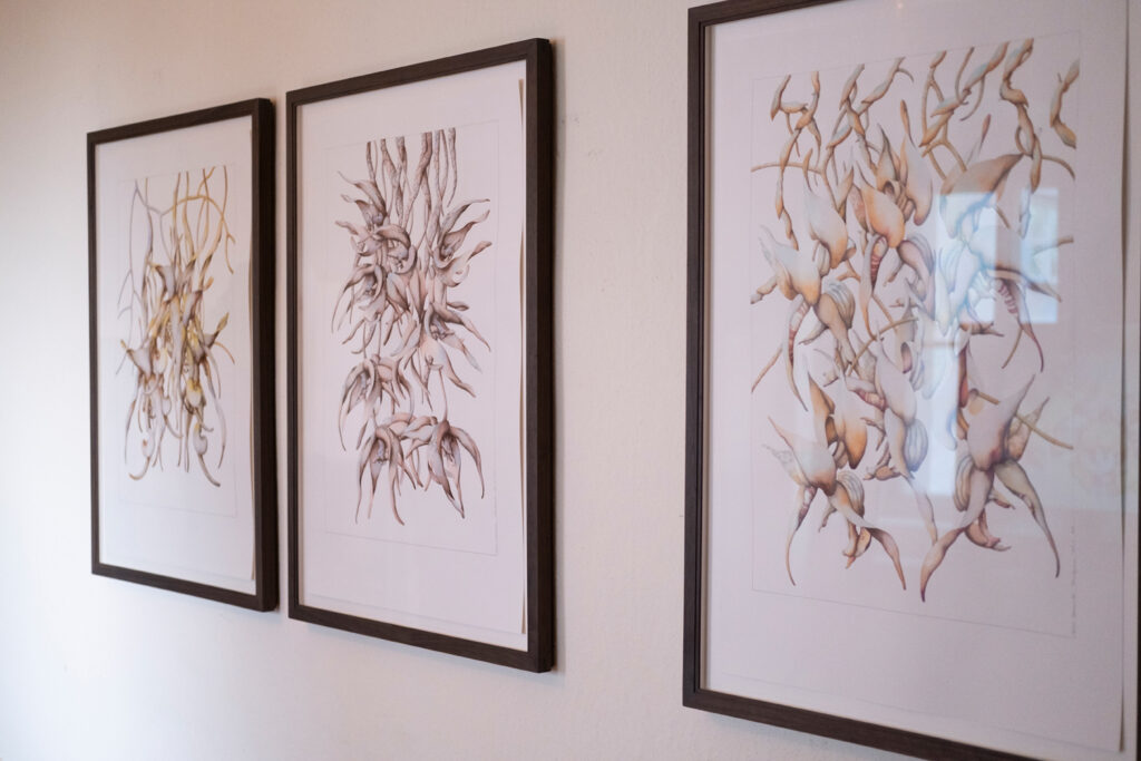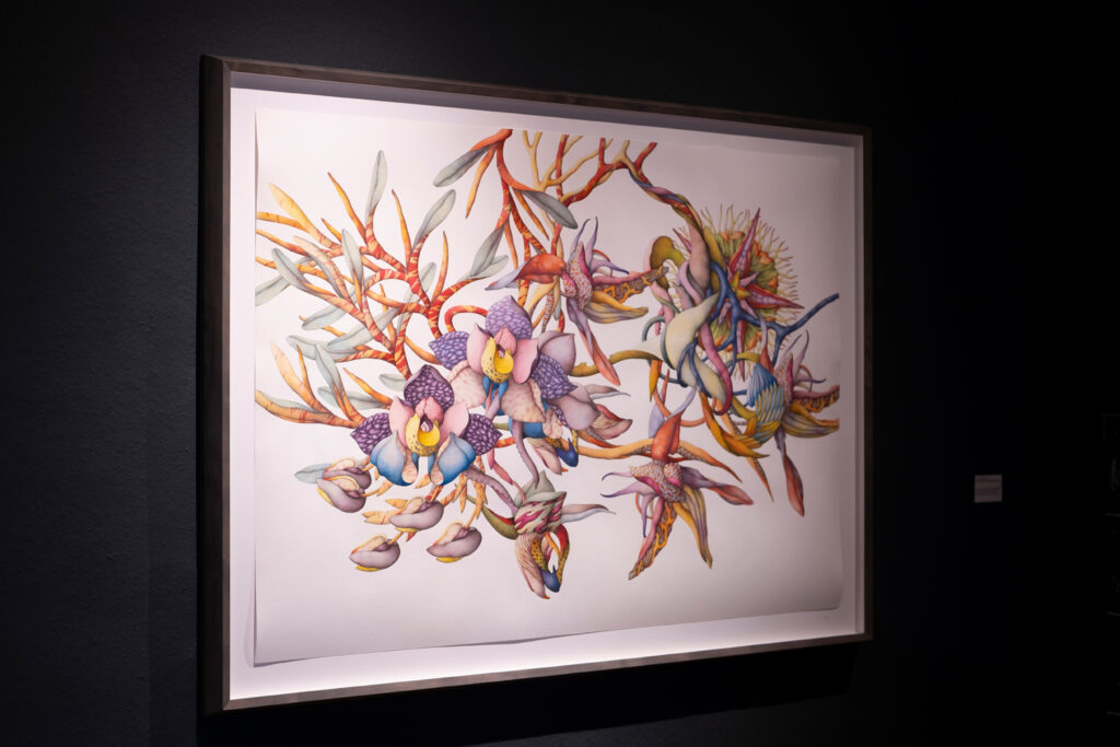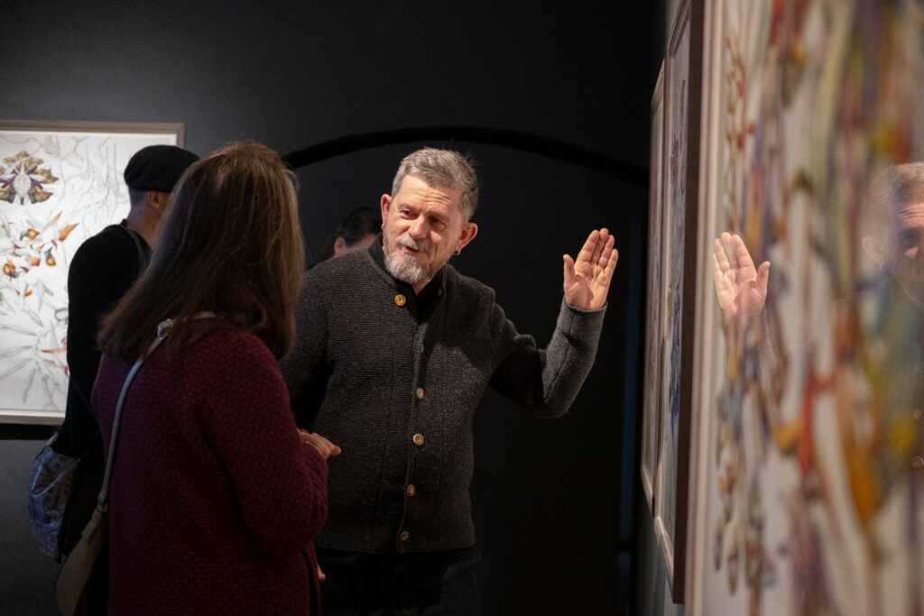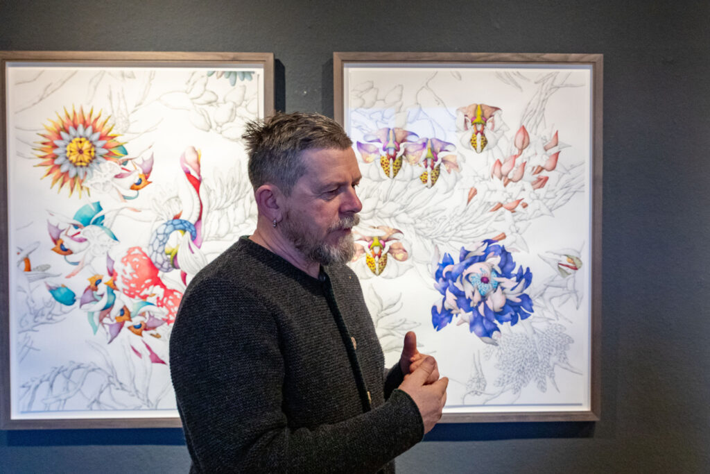 Wild verschlungen ranken sich exotisch anmutende Pflanzen in Miron Schmückles Bildern über das Papier. Die Arbeiten bewegen sich zwischen Schönheit und Irritation und verhandeln Themen wie Vergänglichkeit, Sinnlichkeit und das Verhältnis von Mensch und Natur. Dabei entfaltet der Künstler einen üppigen farbigen Kosmos, in dem klassische botanische Darstellungsweisen auf eine surreal aufgeladene Bildsprache treffen. Sinnliche Blüten, verschlungene Pflanzenformen und körperhafte Anmutungen verwischen die Grenzen zwischen Pflanze, Tier und Mensch und eröffnen einen poetischen Raum zwischen Verführung und Fremdheit, Realität und Imagination. Bis heute hat er seinen einzigartigen, unverwechselbaren Stil konsequent weiterentwickelt. Sein zentrales Motiv: die Schöpfung. Die Leidenschaft für die Pflanzenwelt, so sagt er, sei ihm angeboren. In „Das Prinzip der Blüte“ zeigt Miron Schmückle neue Arbeiten, die er in den letzten Wochen für diese Ausstellung produziert hat. Eine überdimensionierte Installation von Schmückles floralen Motiven ist in der Ortsmitte an der Fassade des alten Schulhauses zu sehen.