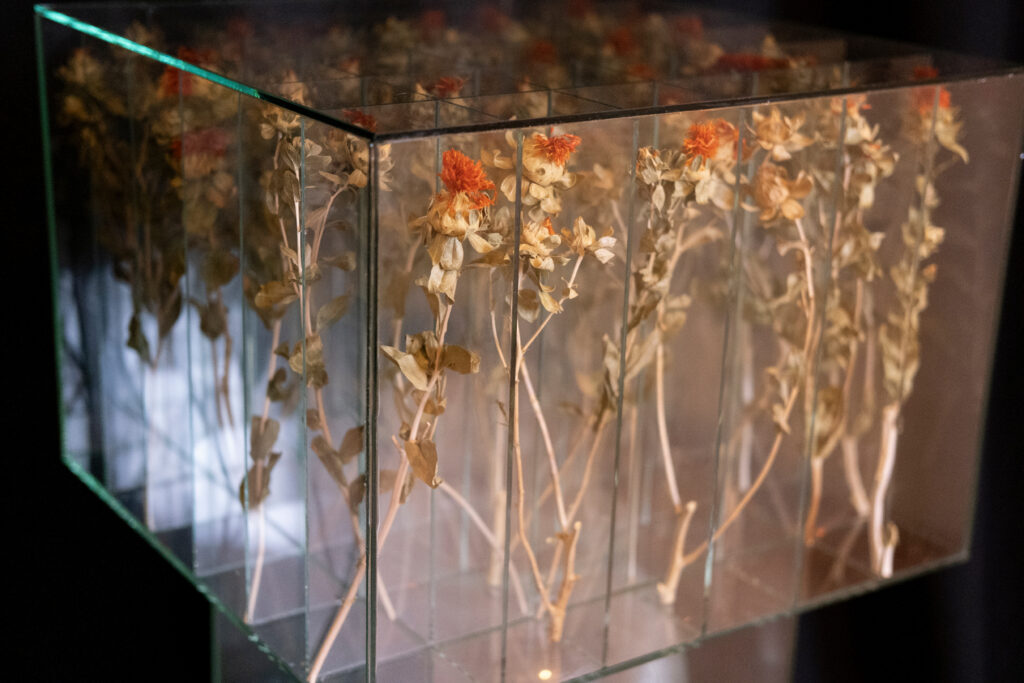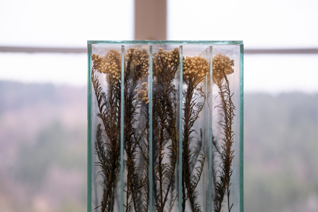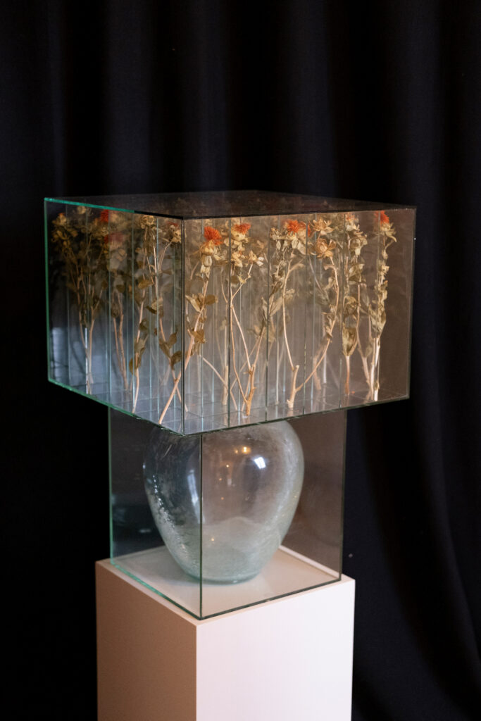 Mit den Arbeiten des ungarischen Bildhauers und Installationskünstlers Sándor Körei tritt die Dreidimensionalität in den Raum. Ausgehend von einfachen, alltäglichen Naturphänomenen wie frisch geschnittenen Blumen, Vasen oder Fragmenten botanischer Formen arrangiert Körei strenge Kompositionen in Glasstrukturen. Elemente aus der Natur scheinen in seinen Werken durch transparente Schichtungen stets auf Distanz gehalten zu sein. Diese skulpturalen Systeme ähneln wissenschaftlichen Versuchsanordnungen, die Sichtbarkeit erlauben, aber das Wahrnehmen zu einem bewussten Akt werden lassen. „Indem ich lebende Elemente in einer kontrollierten Umgebung versiegele, greife ich die Tradition des Stilllebens aus einer zeitgenössischen skulpturalen Perspektive auf.“ Hinter der Schönheit und den leuchtenden Farben der Blumen verbirgt sich auch bei ihm die Präsenz von Zeit, Verfall und Verwandlung. In dem Moment, in dem die Skulptur verschlossen ist, übergibt er sie der Zeit.