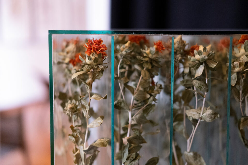 Sándor Körei Turquoise Glass Vase With Safflower, 41x41x60cm, flowers, vase, plate glass (Courtesy: Ani Molnár Gallery)